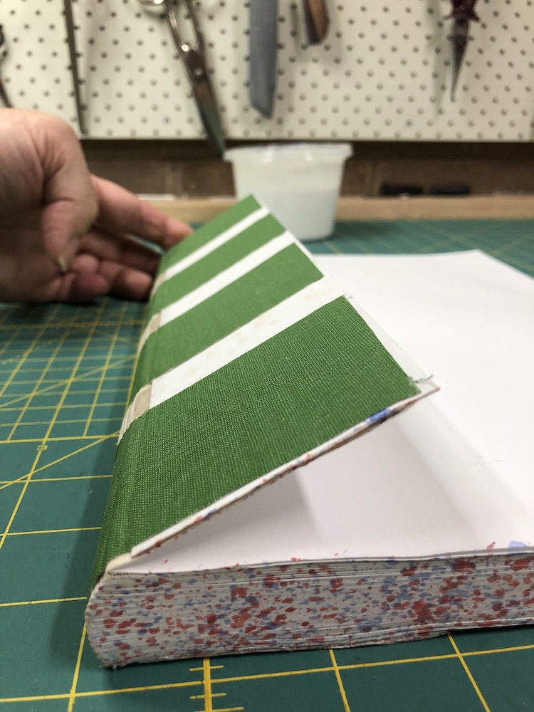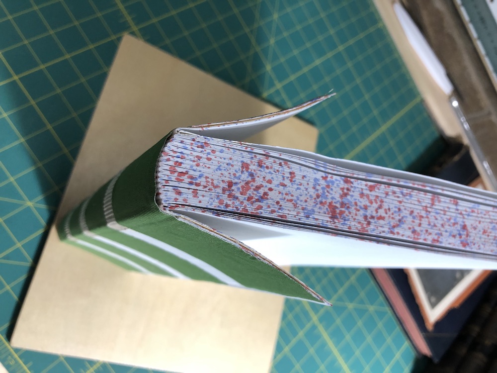 Last week I had a problem while doing a springback binding. The way I’d constructed the tabs had resulted in them curling out. Since they have to be inserted into split boards, I wanted them flat. So, I pasted bank paper on the tab to pull them back in straight. When doing this you want the paper to expand as much as possible. So, paste out the paper with wet paste and leave it for awhile and then paste again. The result was nice flat tabs.