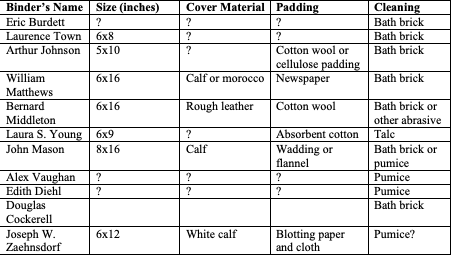 Survey of bookbinding authors and their recommendations, where found, for the size of gold cushions, the covering and padding materials, and cleaning substance.  Covering material can assumed to be rough calf or goat, but if an author is specific it is noted.